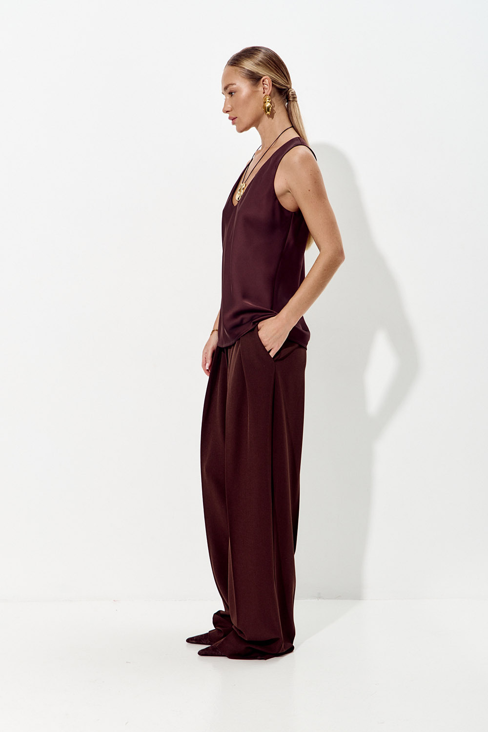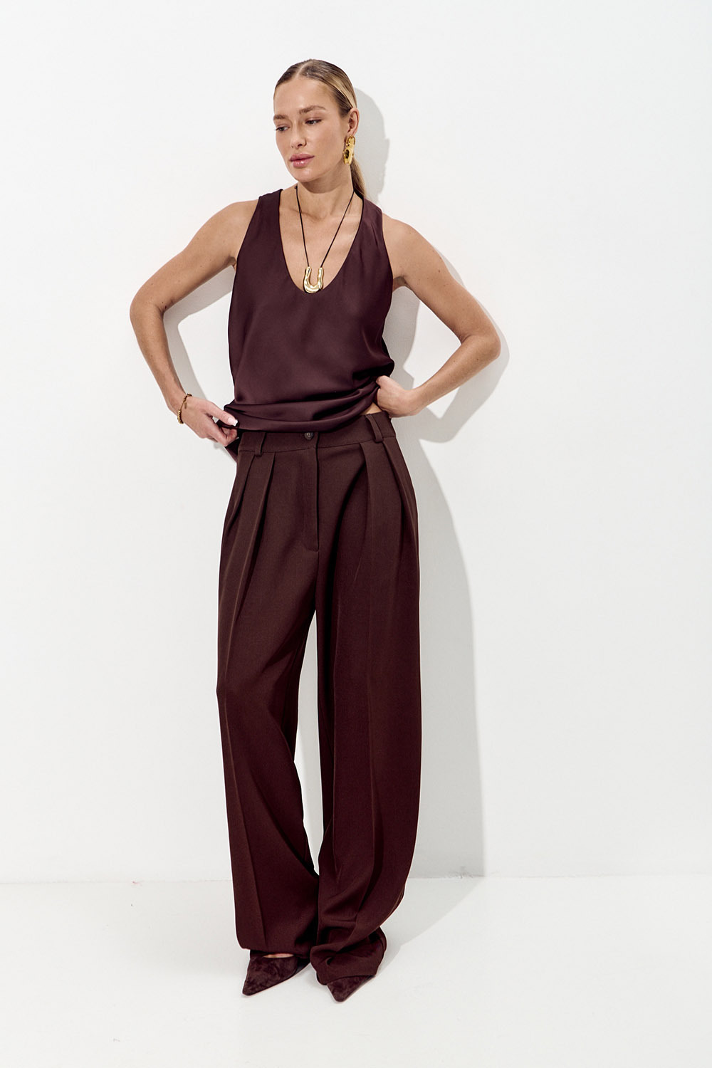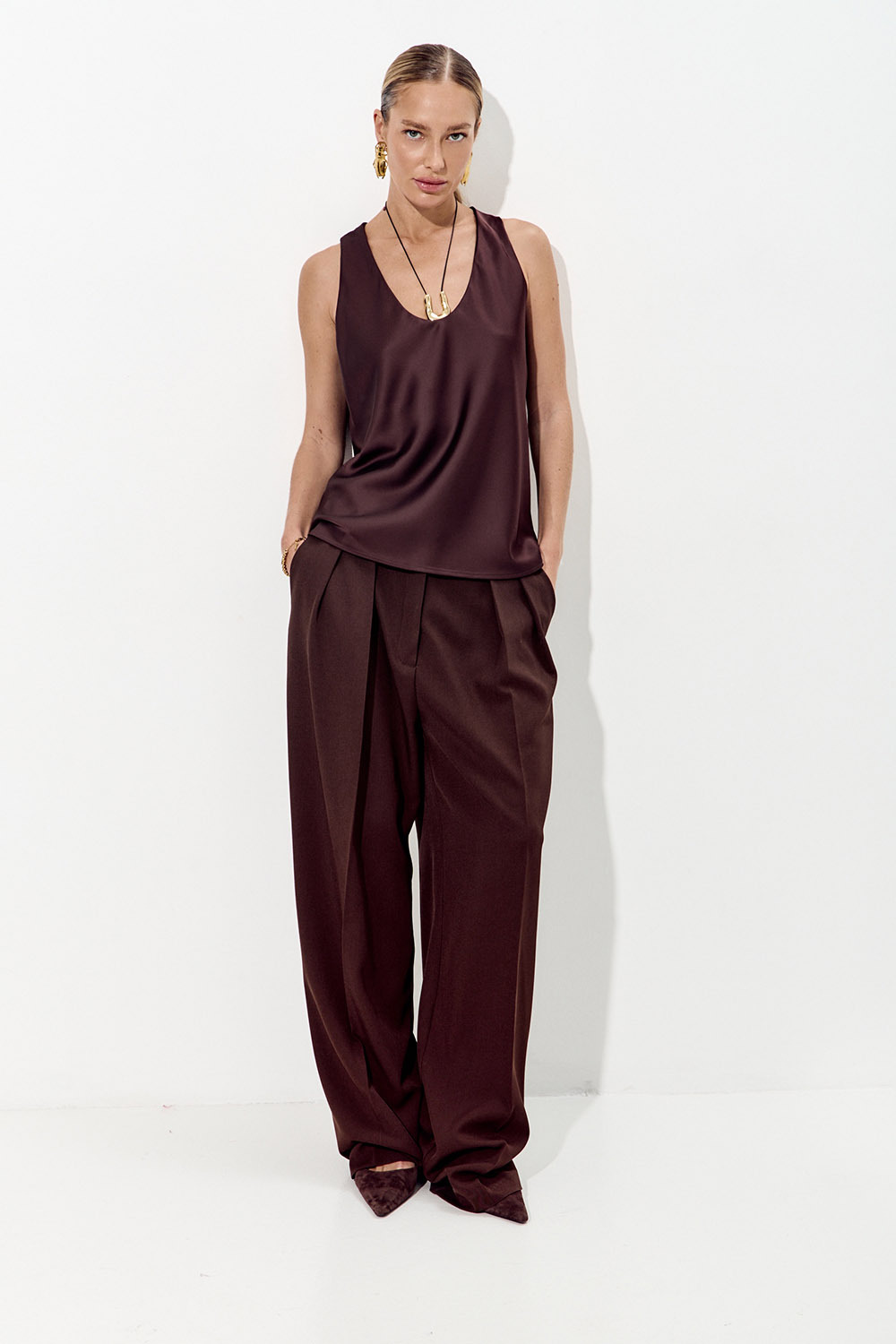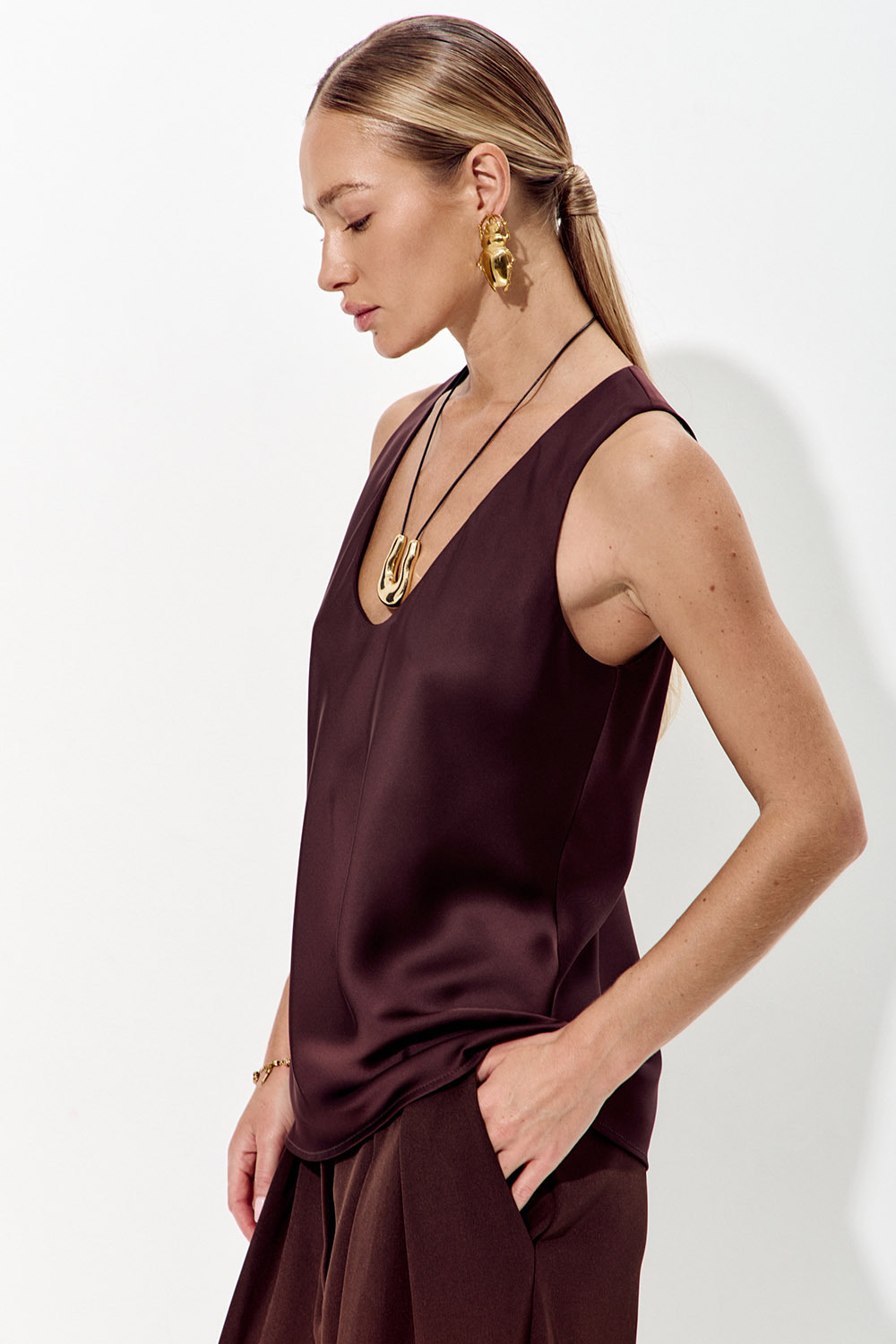 Майка из атласа с глубоким вырезом шоколадного цвета