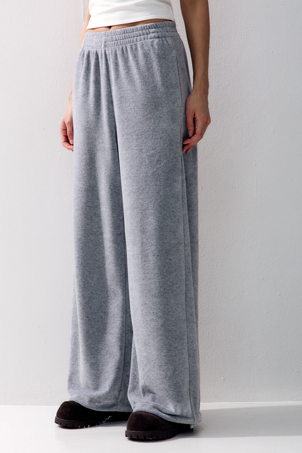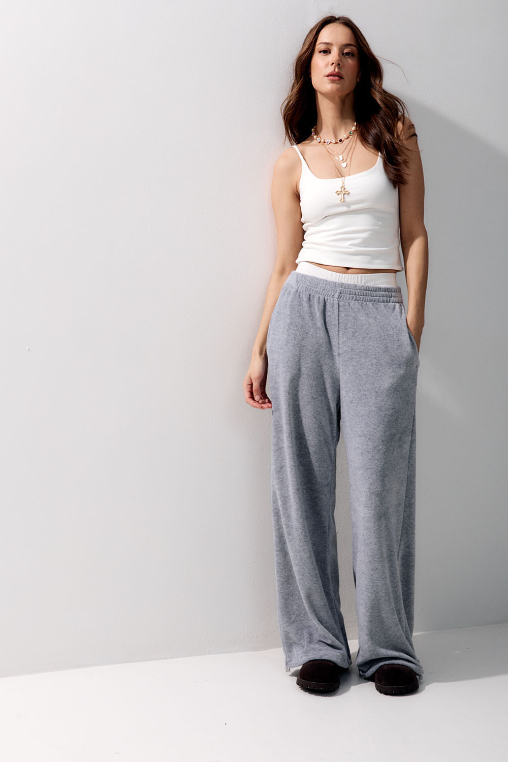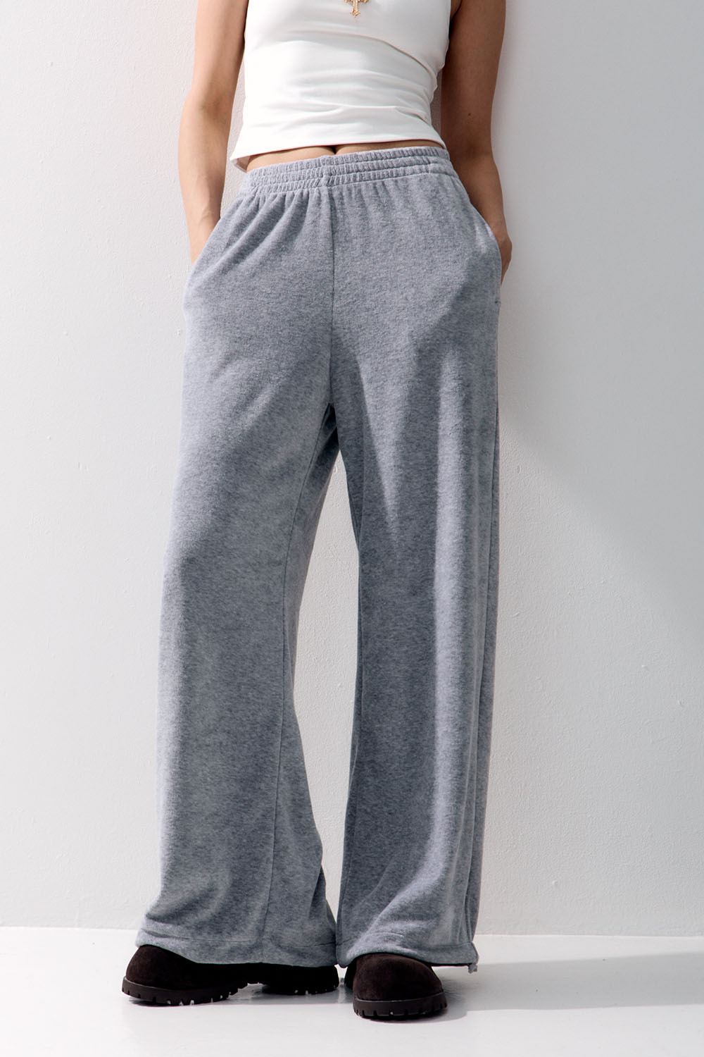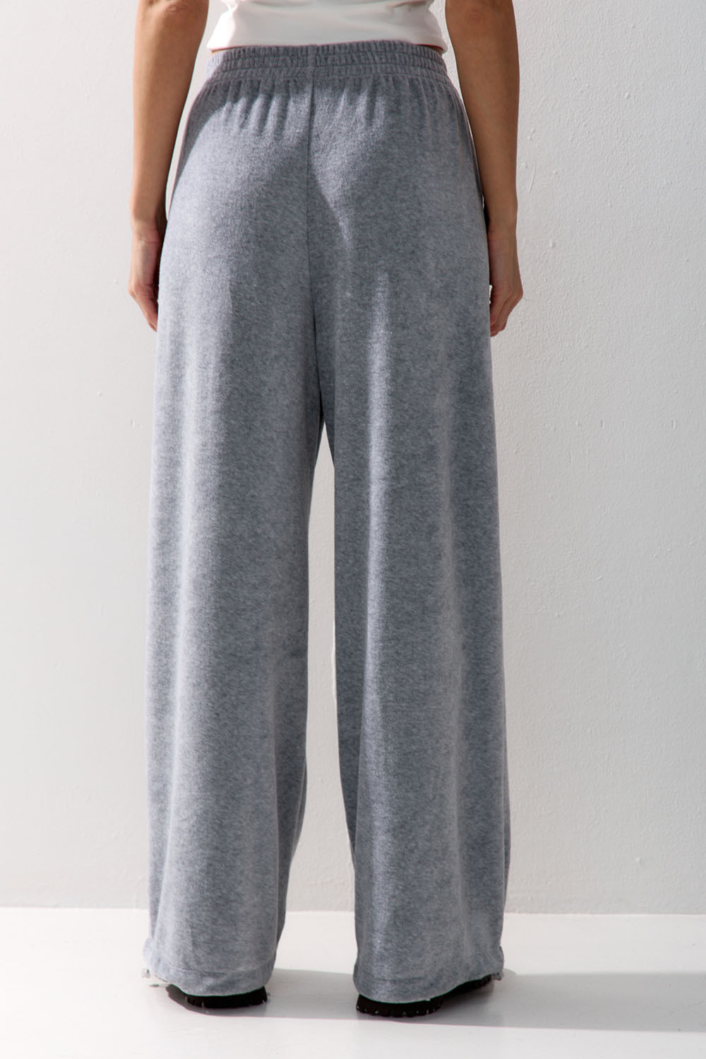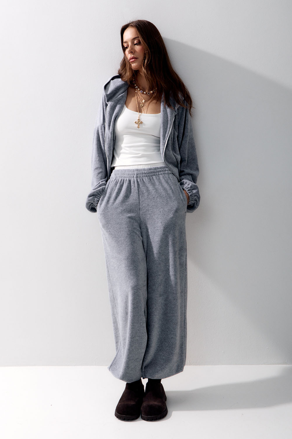 Широкие брюки в спортивном стиле из велюровой ткани цвета серый меланж. Модель свободного кроя с кулиской снизу для зауживания штанин. Брюки полной длины и с боковыми карманами для комфортных и расслабленных образов в стиле Sport Chic. Идеально сочетаются с базовыми топами и худи из велюра для создания единого костюма.
