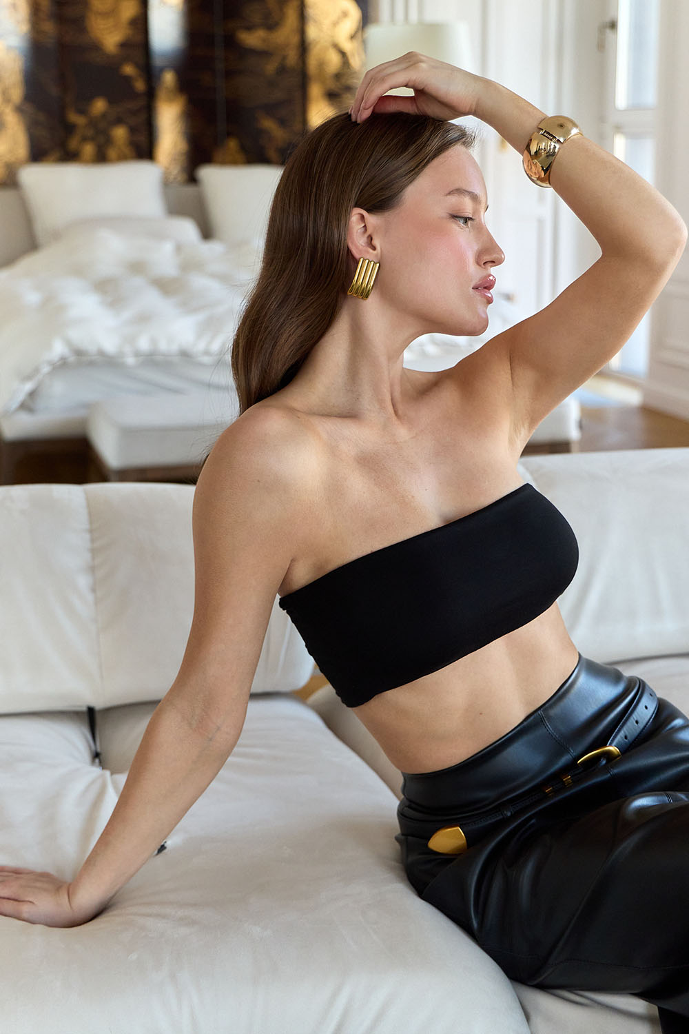 Топ-бандо простого дизайна из модала черного цвета. Модель ненавязчиво подчеркнет декольте и спину. Эффектно смотрится с юбками, под ажурные блузы, полупрозрачные лонгсливы и под пиджак.