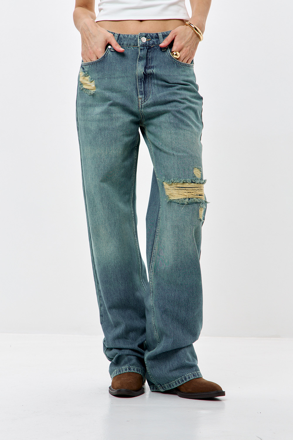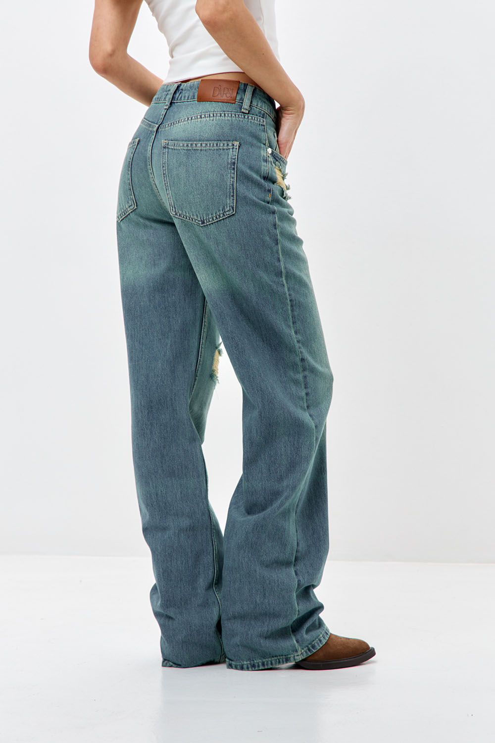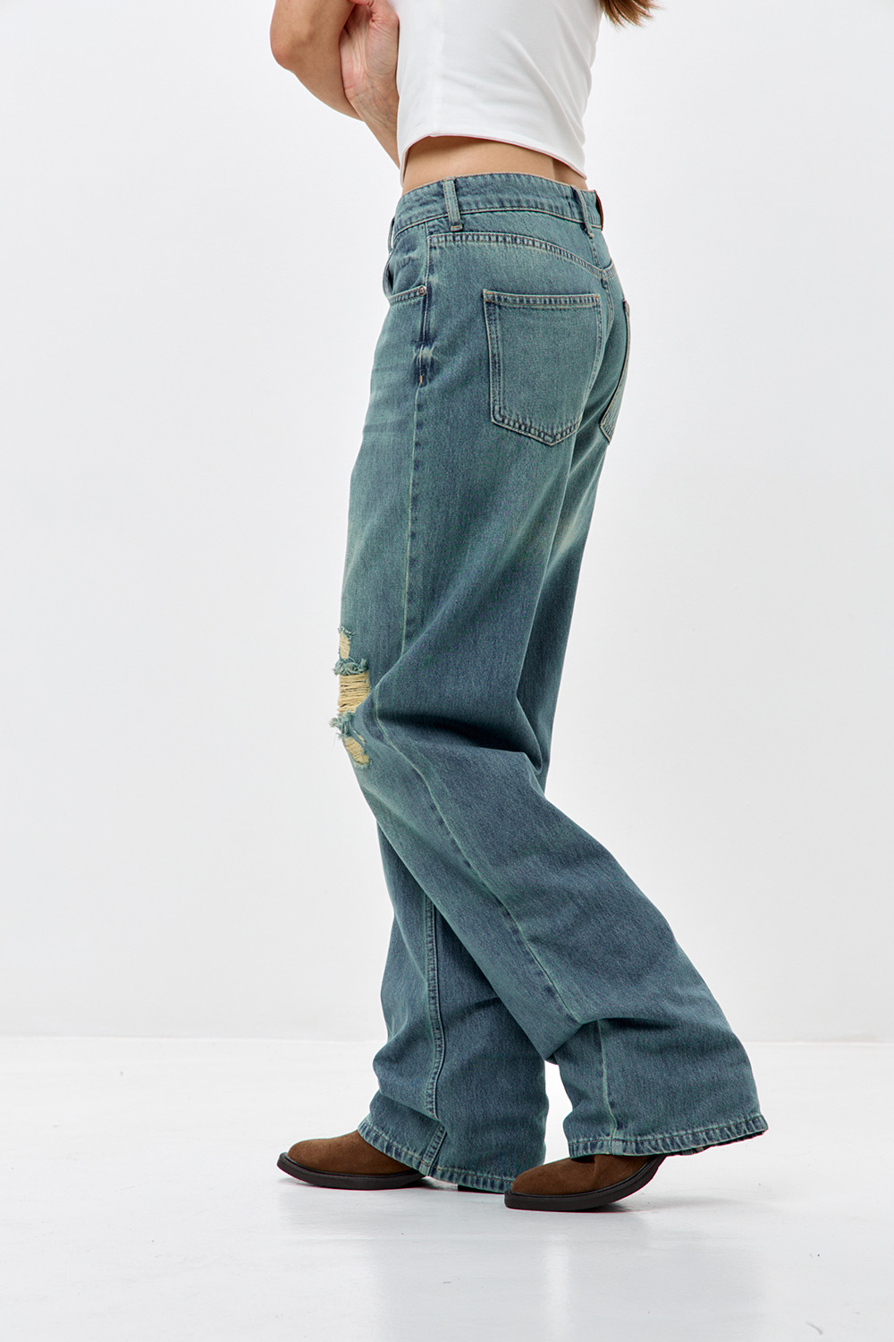 - Джинсы wide leg с потертостями сине-зеленого цвета