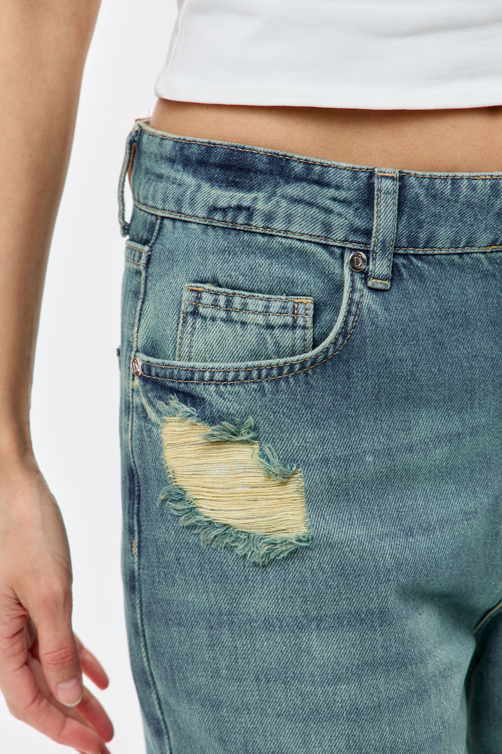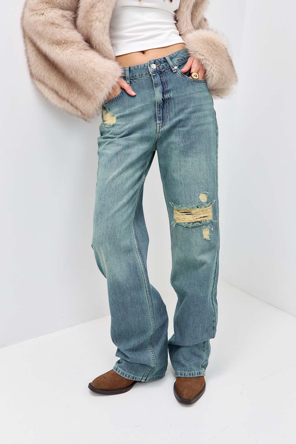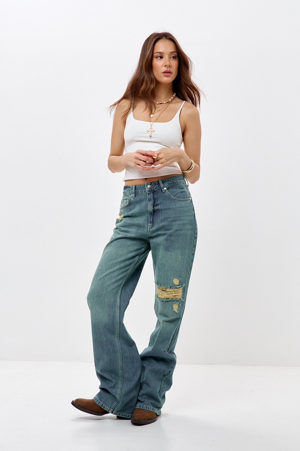 - Джинсы wide leg с потертостями сине-зеленого цвета