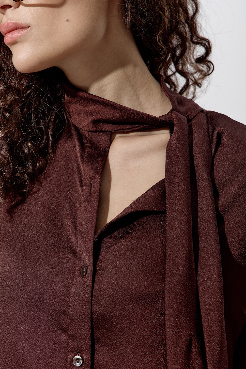 Эффектная блуза из струящегося шифона в цвете шоколад. Модель свободного кроя с объемными рукавами на манжетах. Блуза дополнена тонким изящным шарфом в тон на воротнике.