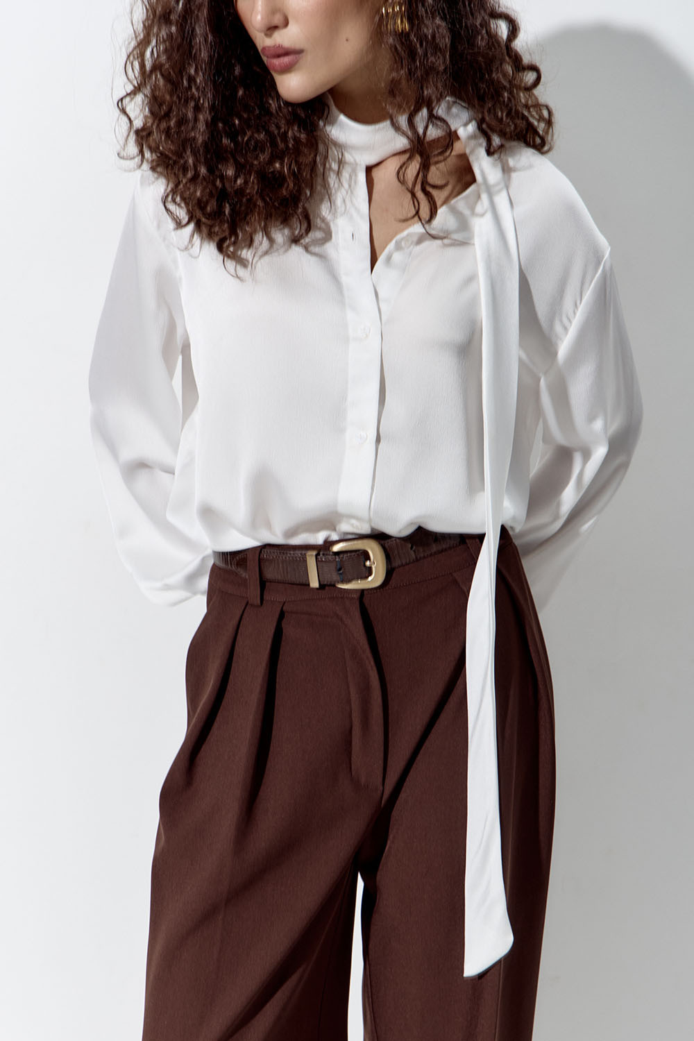 Эффектная блуза из струящегося шифона цвета айвори. Модель свободного кроя с объемными рукавами на манжетах. Блуза дополнена тонким изящным шарфом в тон на воротнике.