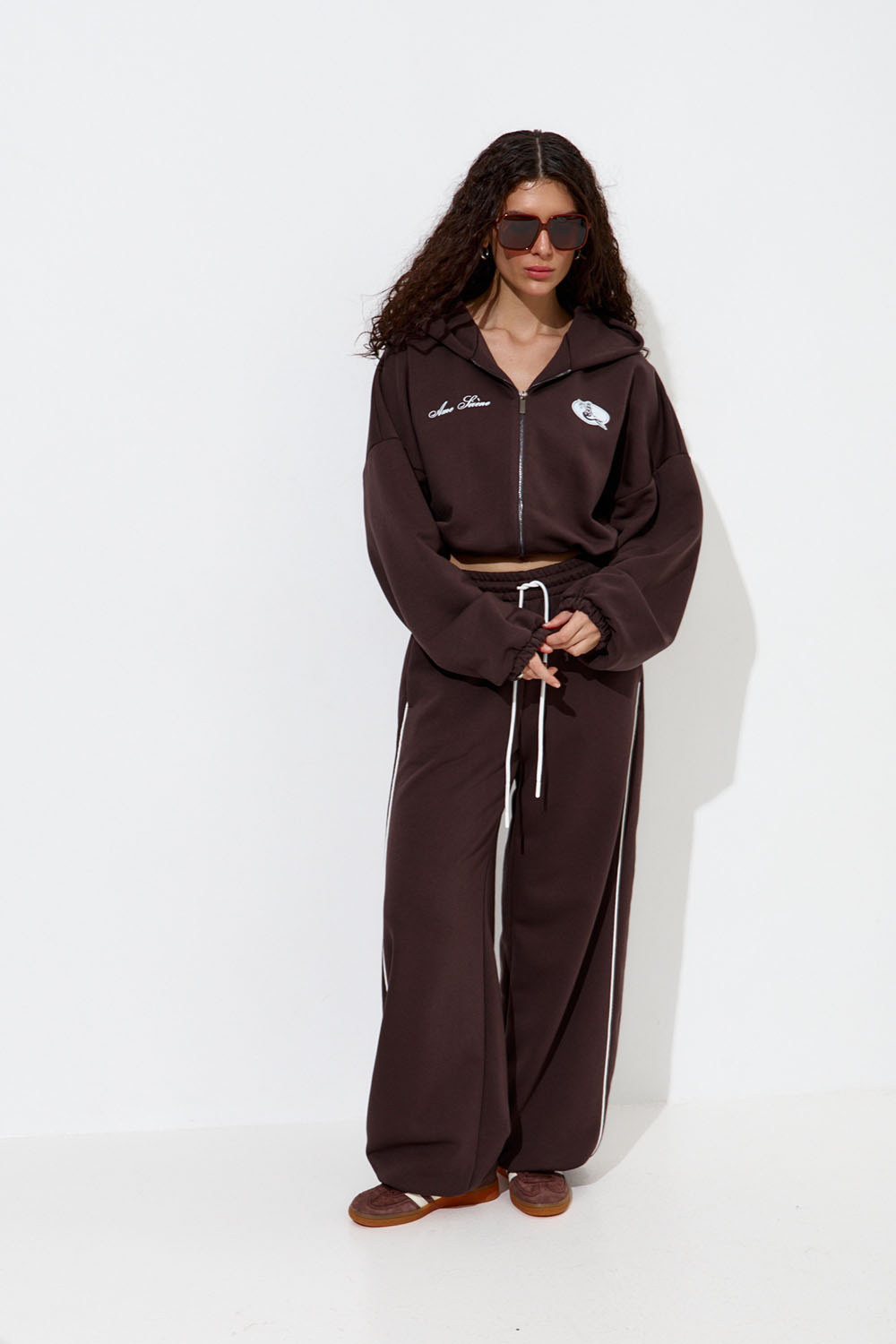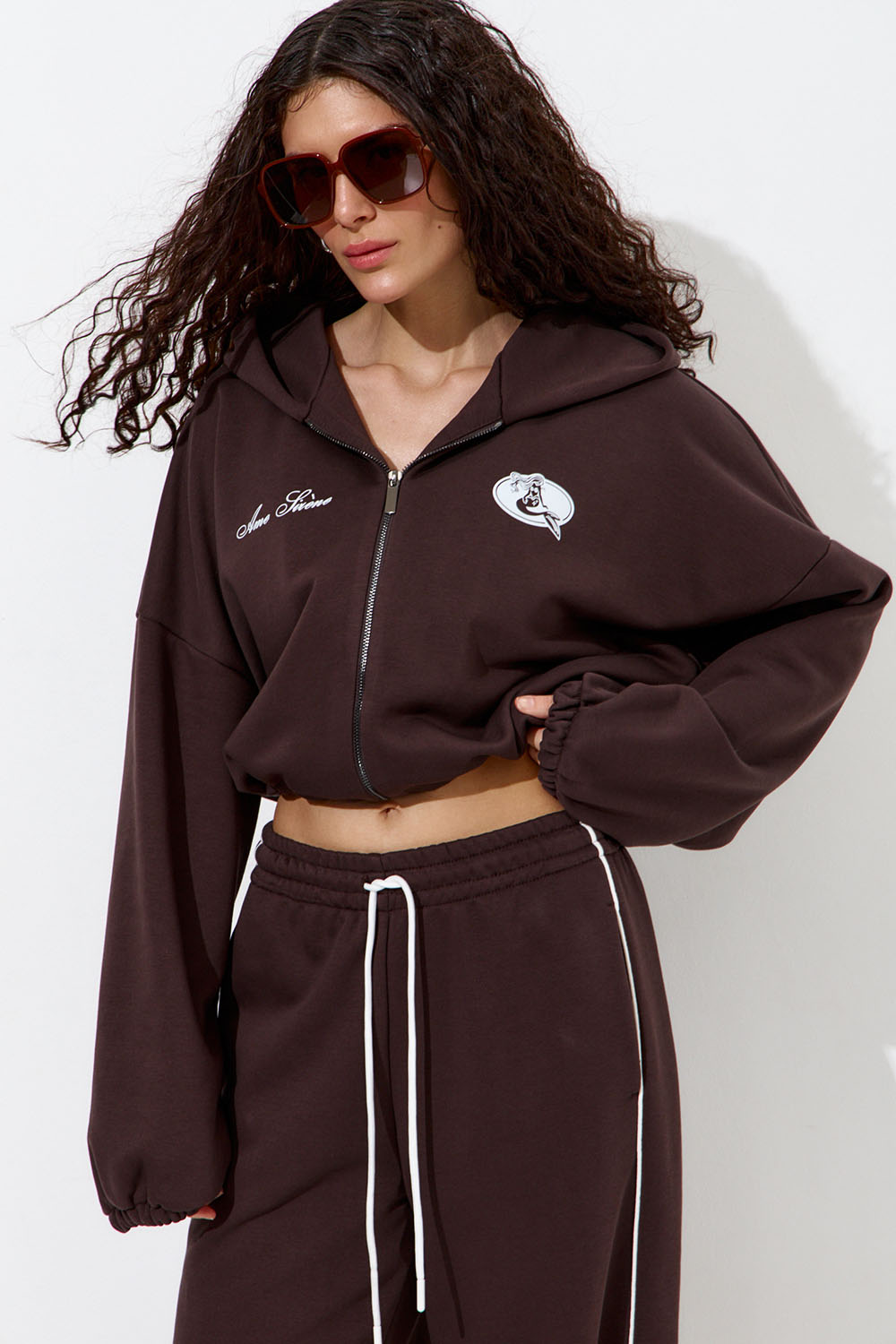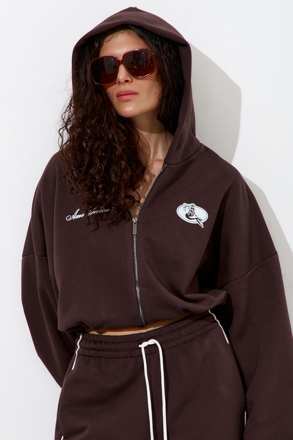 Укороченное худи с капюшоном из мягкого футера цвета шоколад с принтом "Âme Sirène" (душа русалки). Модель на молнии и объемными рукавами на резинках. Худи дополнено кулиской снизу для создания более округлого силуэта. Оверсайз крой, свободная посадка для комфортных и расслабленных образов в стиле Sport Chic.
