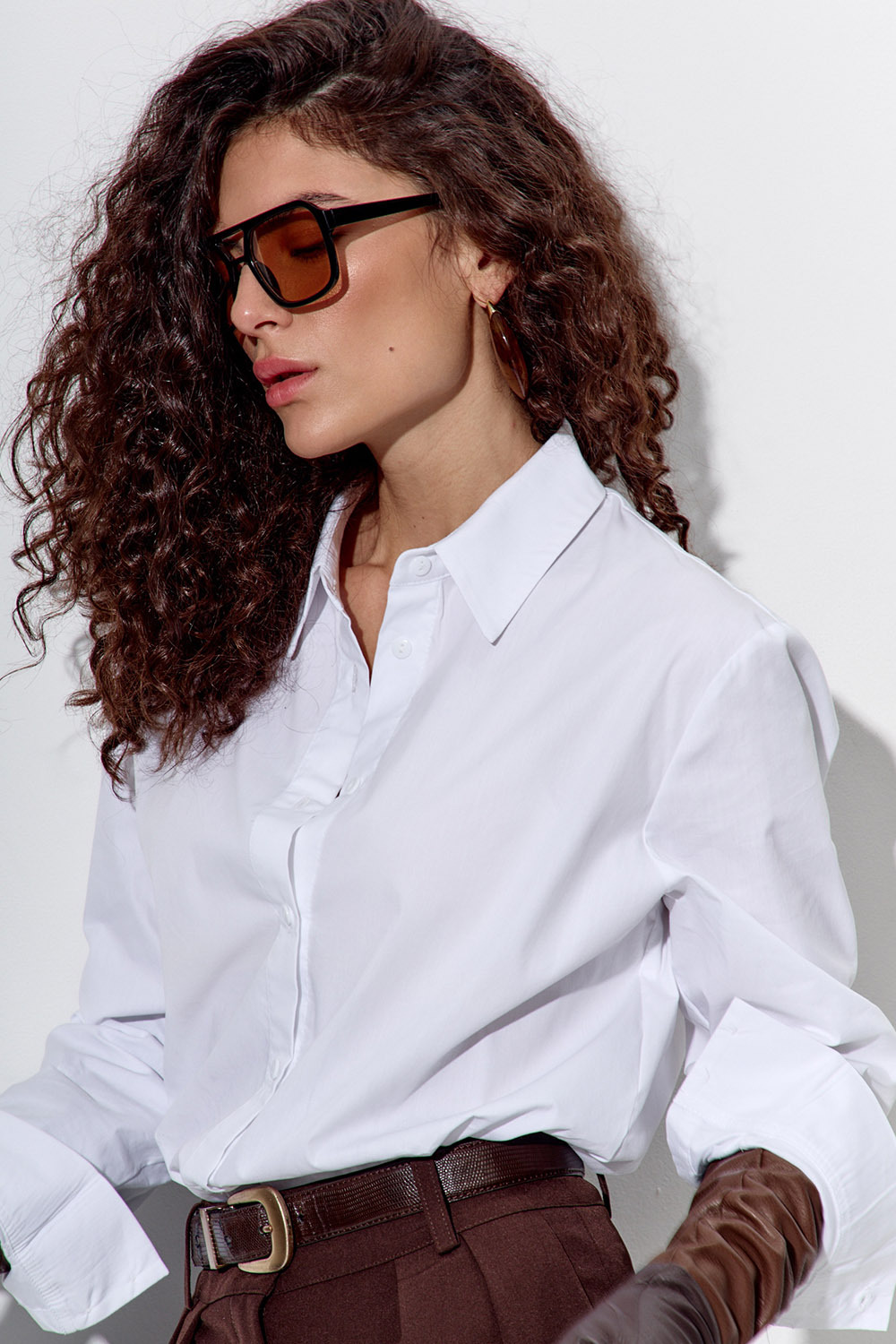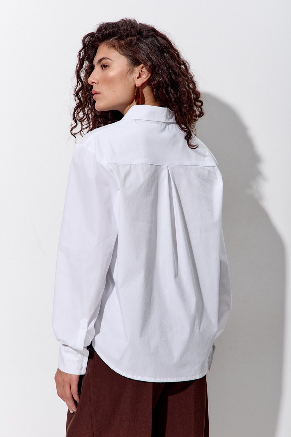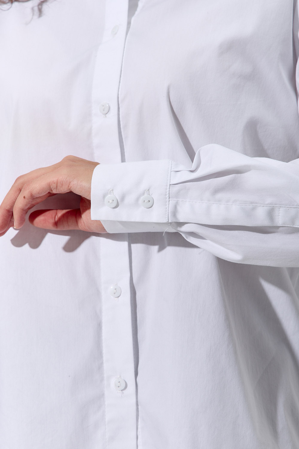 Базовая рубашка из хлопка белого цвета. Модель прямого кроя с отложным воротником и свободными длинными рукавами на манжетах. Комфортная длина, закругленный низ и пуговицы в тон.