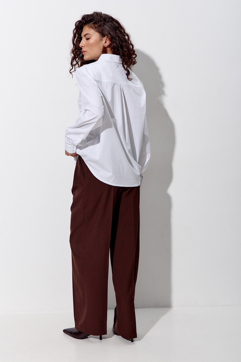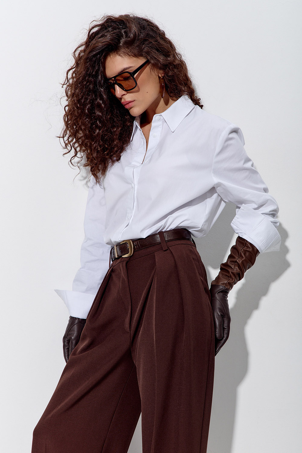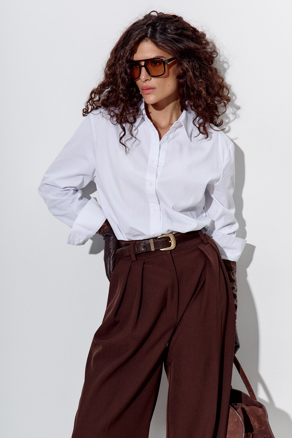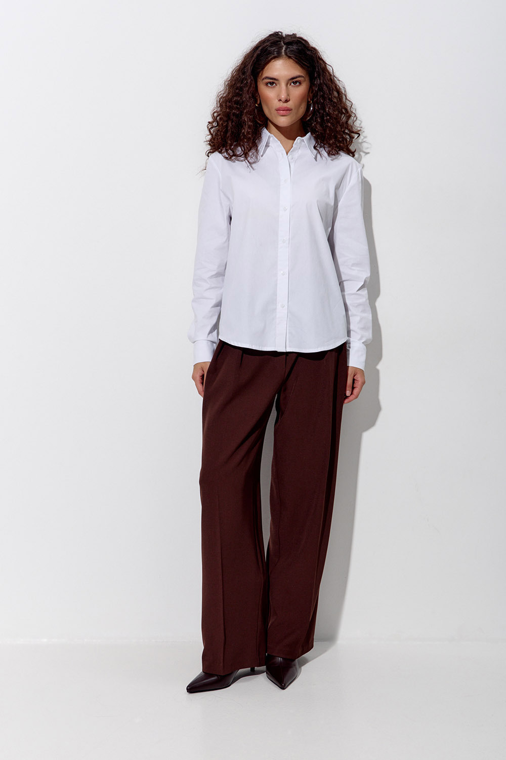 Базовая рубашка из хлопка белого цвета. Модель прямого кроя с отложным воротником и свободными длинными рукавами на манжетах. Комфортная длина, закругленный низ и пуговицы в тон.