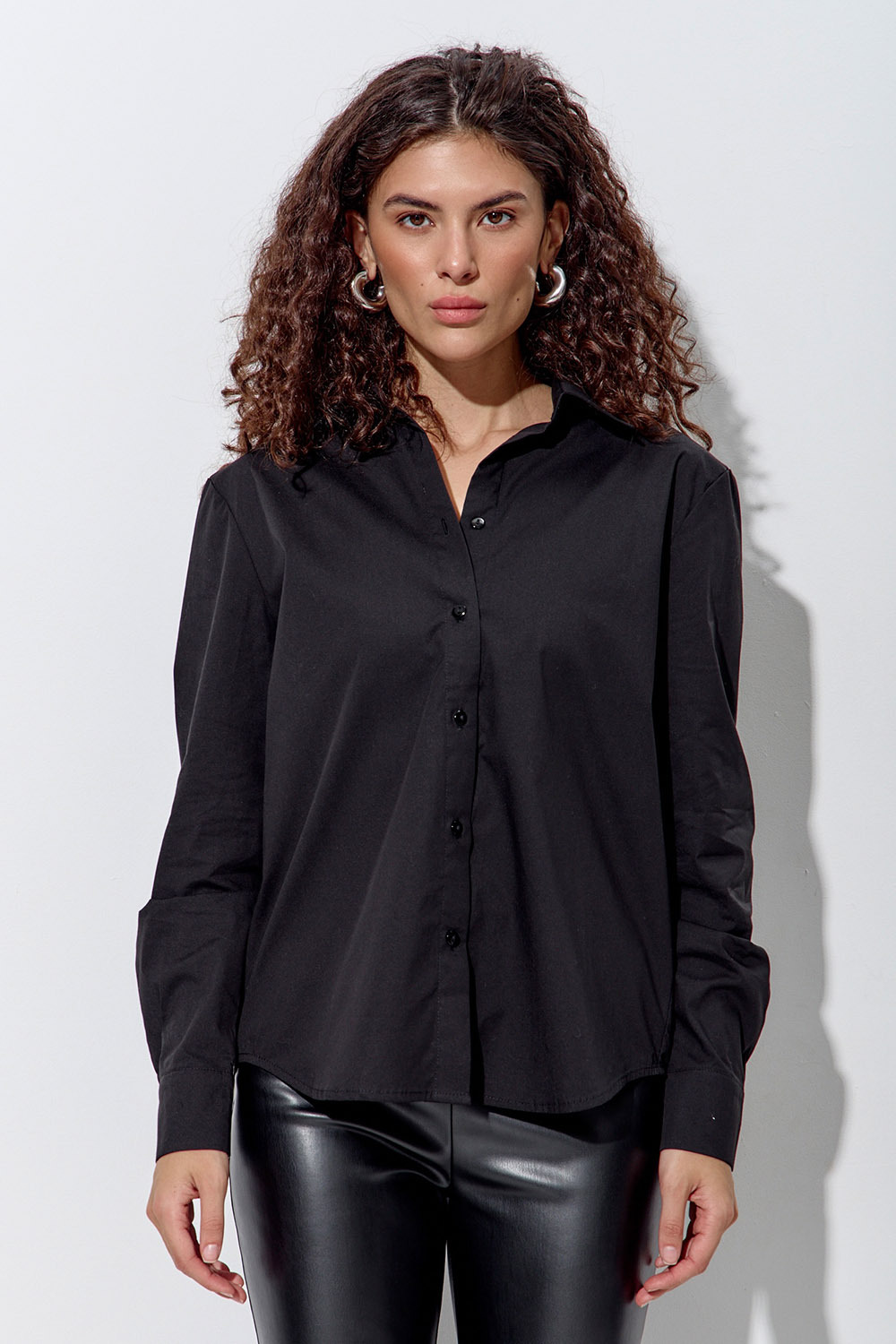 Базовая рубашка из хлопка черного цвета. Модель прямого кроя с отложным воротником и свободными длинными рукавами на манжетах. Комфортная длина, закругленный низ и пуговицы в тон.