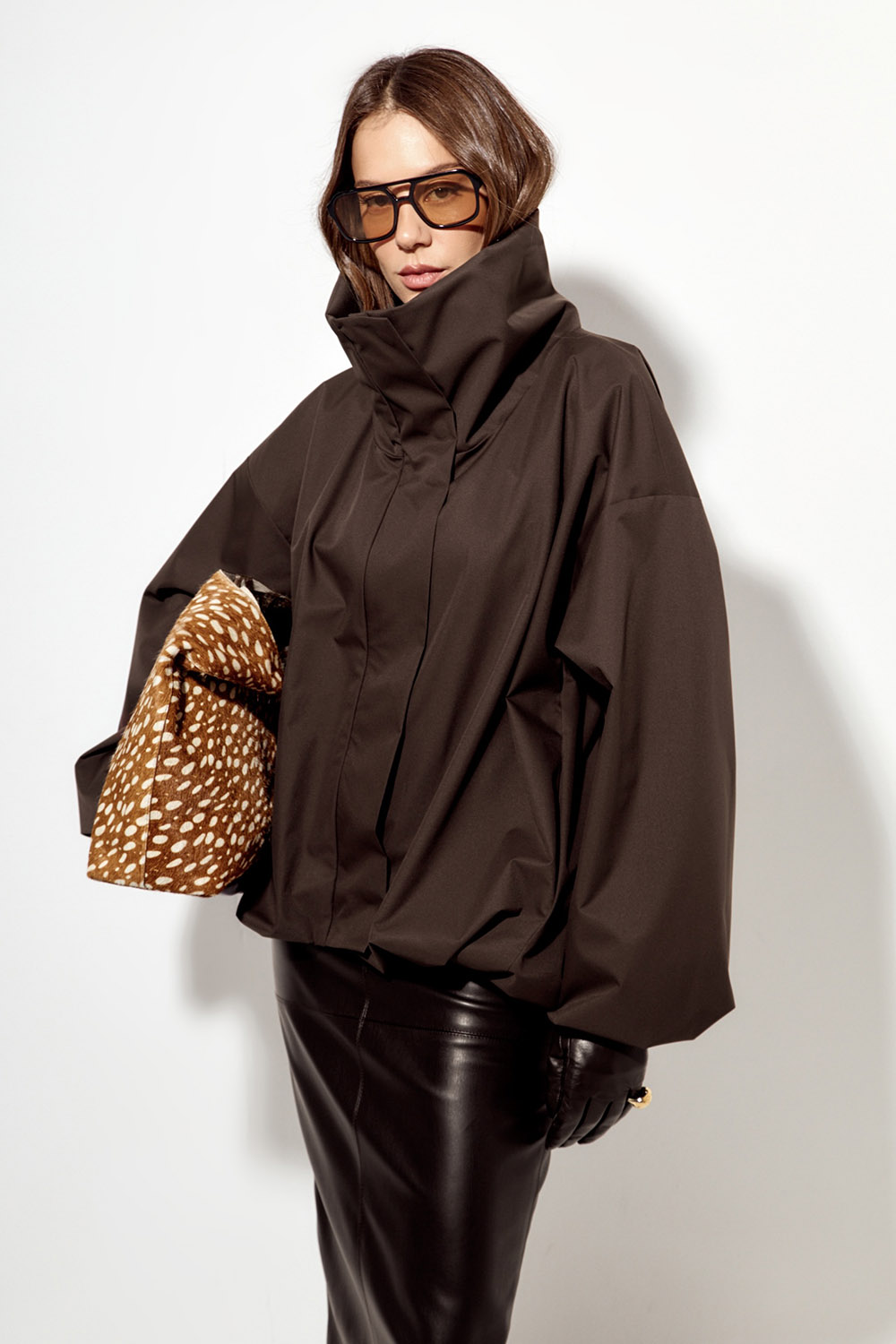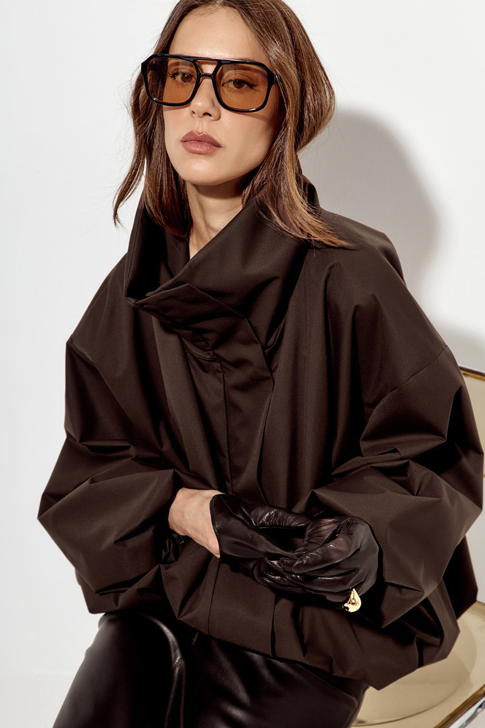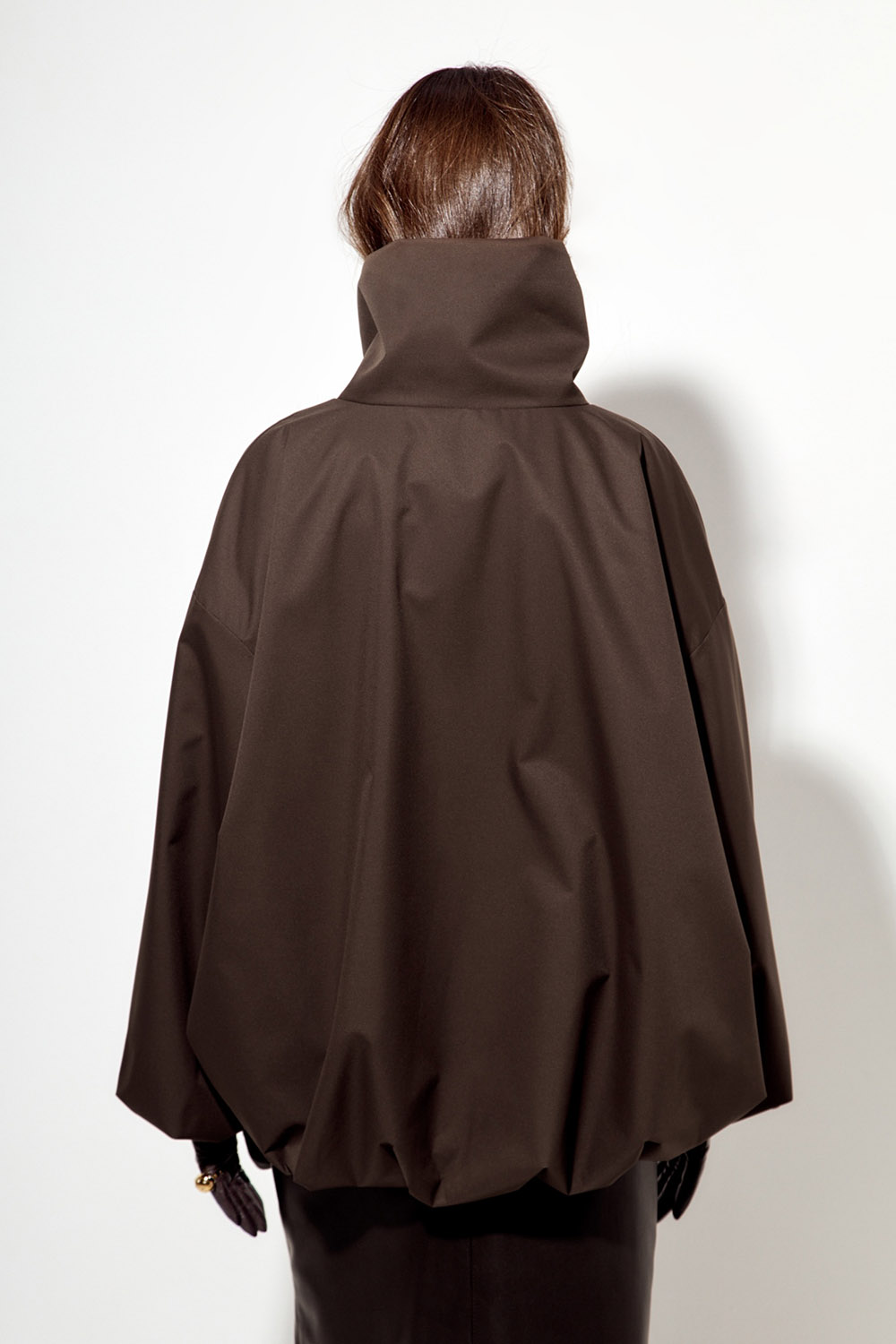 - Ветровка О-силуэта с высоким воротом шоколадного цвета