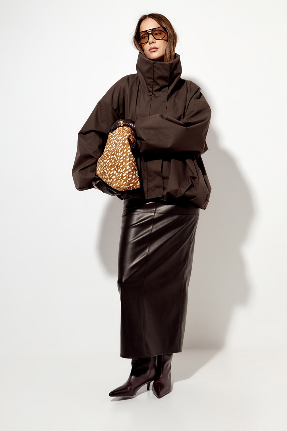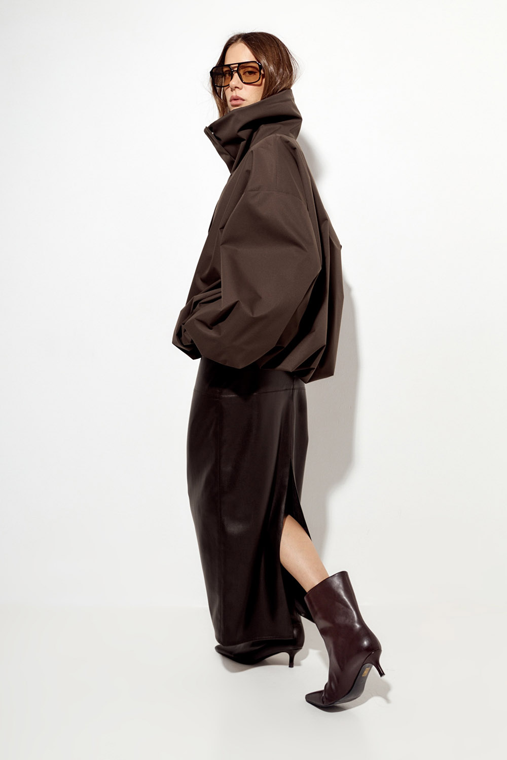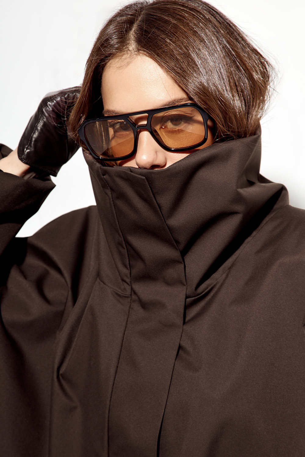 - Ветровка О-силуэта с высоким воротом шоколадного цвета
