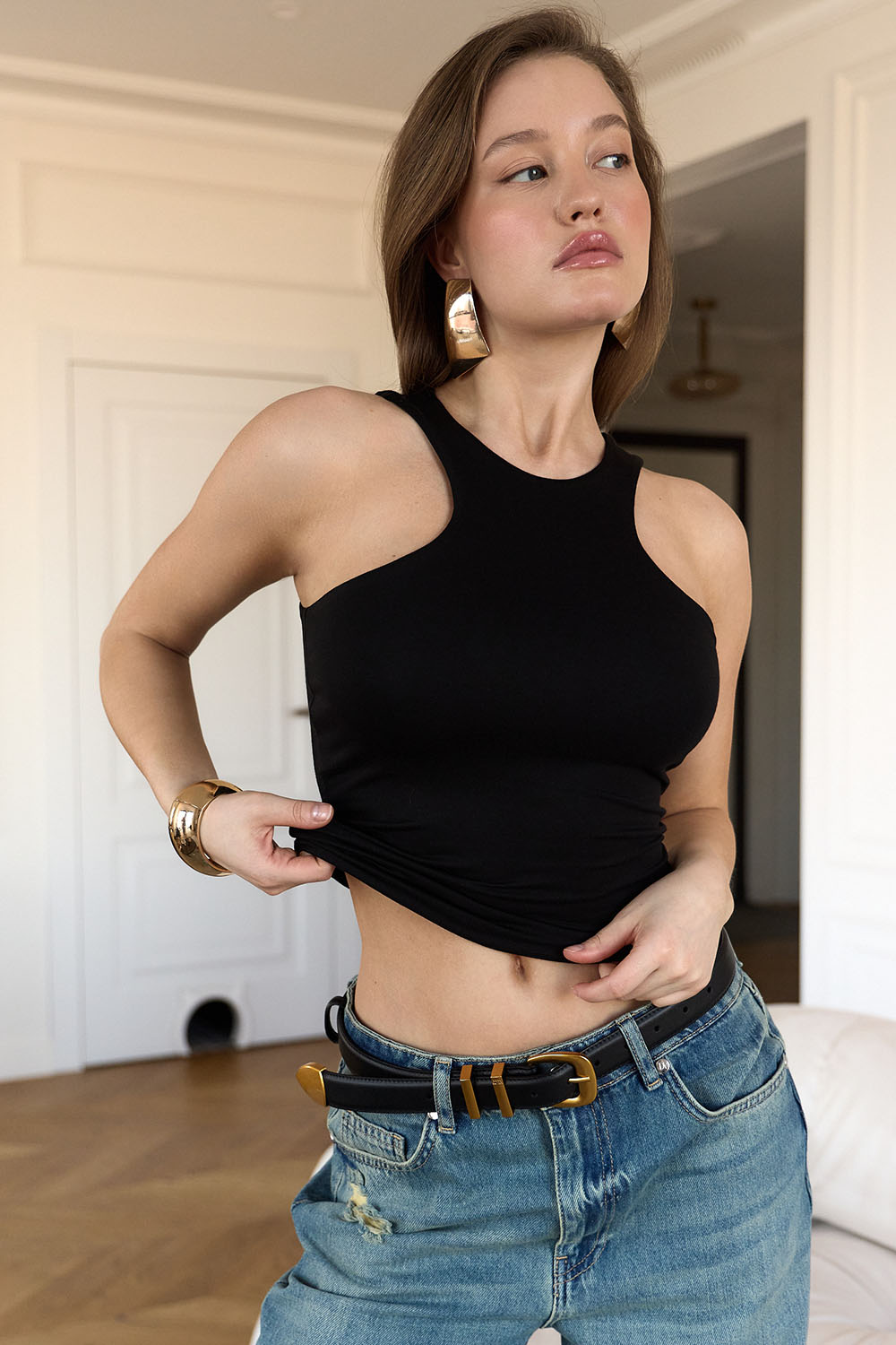 Идеально сочетается с юбками макси, брюками из экокожи и под пиджак.